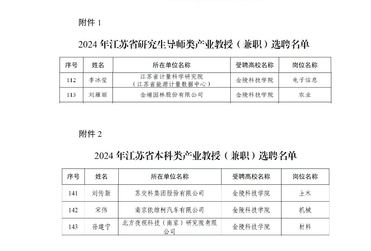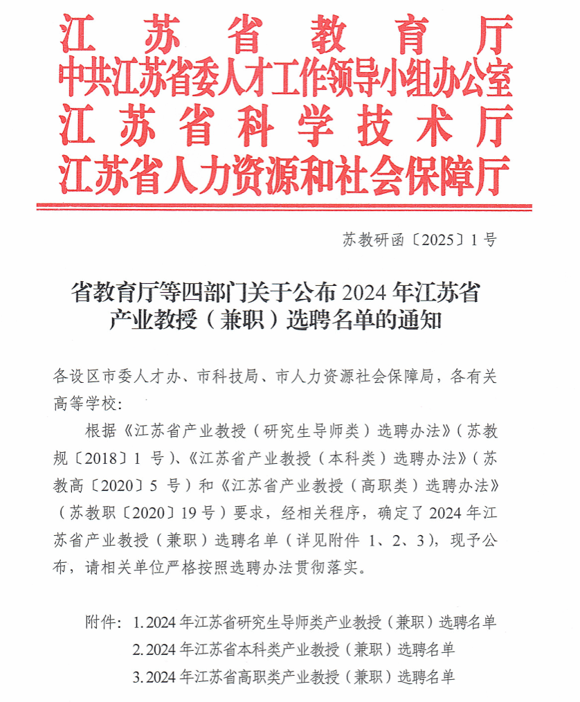 根据《江苏省产业教授(研究生导师类)选聘办法》(苏教规〔2018〕1号)、《江苏省产业教授(本科类)选聘办法》(苏教高〔2020〕5号),我校推荐的李冰莹、刘雁丽获评2024年江苏省研究生导师类产业教授,刘传新、宋伟、孙建宁获评2024年江苏省本科类产业教授。