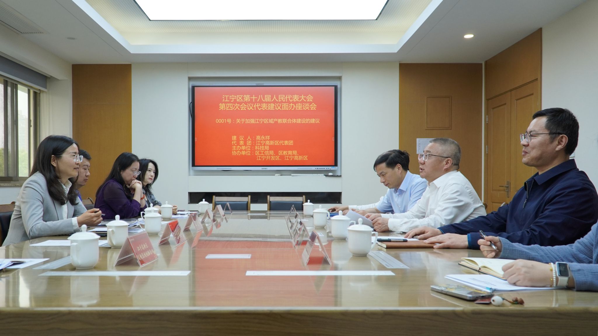 为切实做好人大代表建议办理工作,推动建议办理从“纸上回应”到“落地见效”,4月24日下午,江宁区科技局副局长王文娟带领江宁区工信局、江宁区教育局、江宁开发区科技人才局、江宁高新区高校区校地融合办、江宁高新区人大工委等单位负责人到我校与人大代表就“加强江宁区域产教联合体建设”的建议进行面对面座谈交流。江宁区人大代表、副校长高永祥出席会议,党委办公室、教务处、科技处、合作与发展规划处等部门负责人参加座谈。