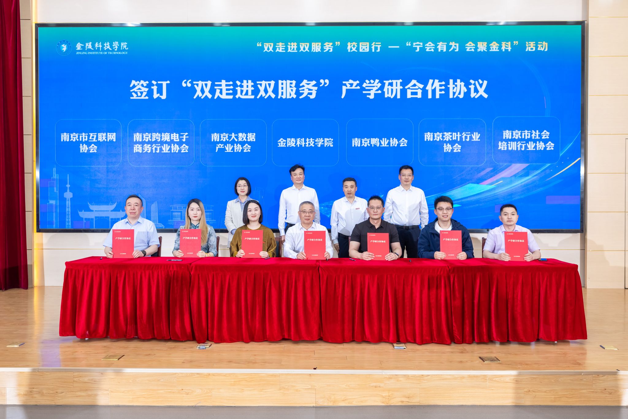 在赵小兵、丁雪、刘春明和季赛的见证下,高永祥代表学校与南京市人工智能行业协会、南京市互联网协会、南京区块链产业应用协会、南京市人力资源产业协会等12家行业协会商会代表签订了产学研合作协议。顾晓燕代表学校向南京工艺美术行业协会、南京交通工程有限公司、数贸云江苏科技有限公司、江苏智慧产教融合研究院、江苏欧帝电子科技有限公司、南京凯莱智能服饰有限公司等26家“明发体育(电子)股份有限公司校外实习基地”授牌。