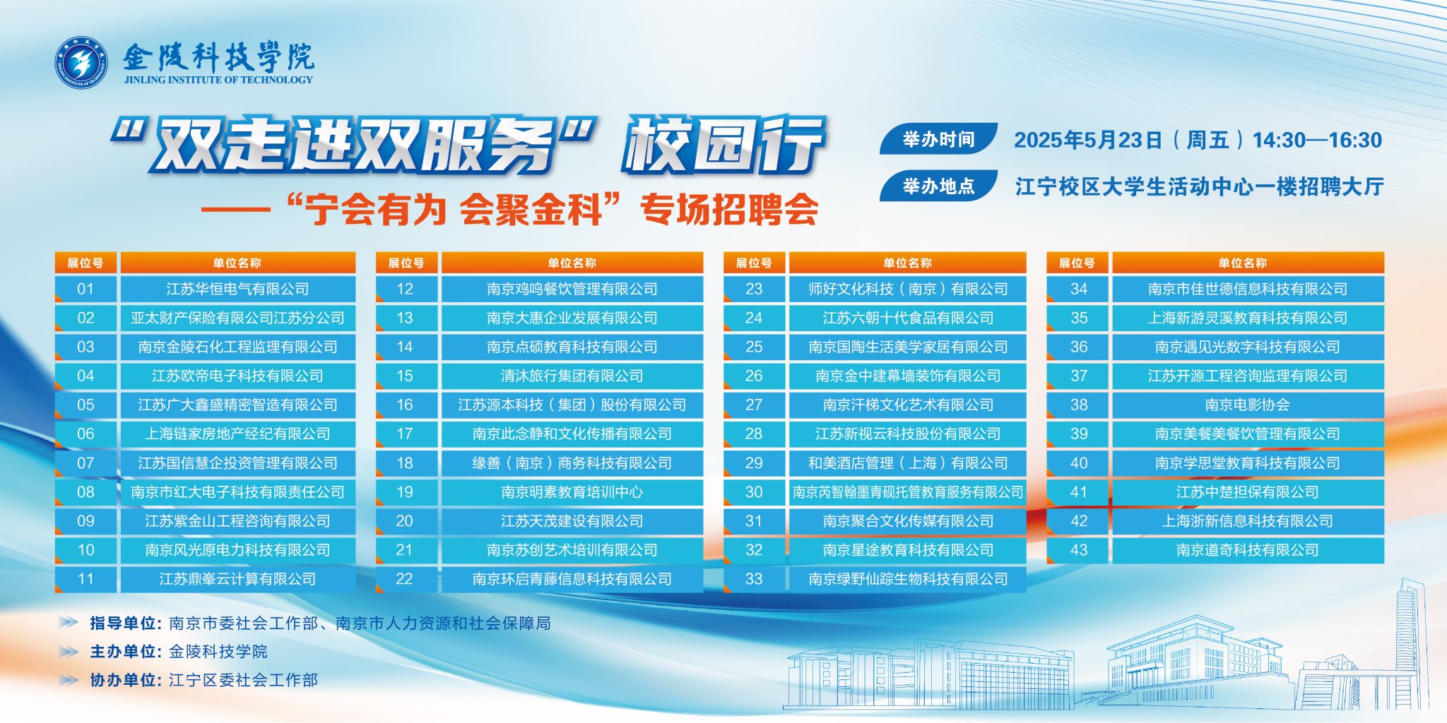 5月23日下午,我校主办“双走进双服务”校园行——“宁会有为 会聚金科”活动,活动由南京市委社会工作部、南京市人力资源和社会保障局指导,江宁区委社会工作部协办。