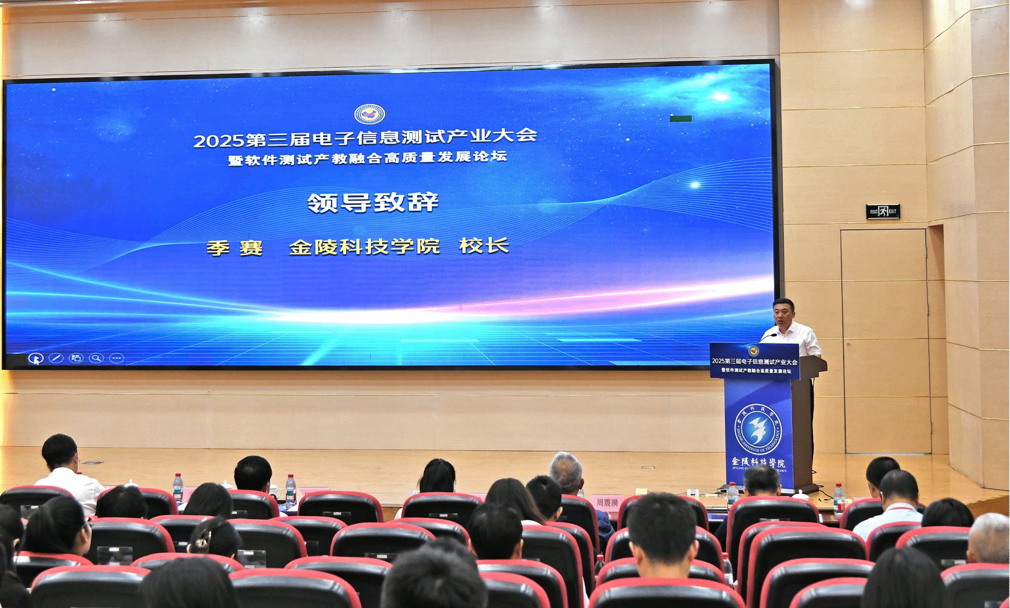 我校校长季赛教授在开幕式上致辞,代表学校对各位专家、领导和嘉宾的到来表示热烈欢迎和诚挚感谢。季校长介绍我校以“地方性、应用型”为办学定位,以“政校城,行教企”融合发展为特色的发展模式,强调了学校“亲产业、进企业、强应用、重转化”的办学导向。他期待通过本次大会的专家报告、技术交流与圆桌对话等环节,洞察电子信息测试产业的前沿动态,碰撞思想火花,凝聚发展共识,共同推动电子信息测试产业与软件测试产教融合向更高质量迈进。