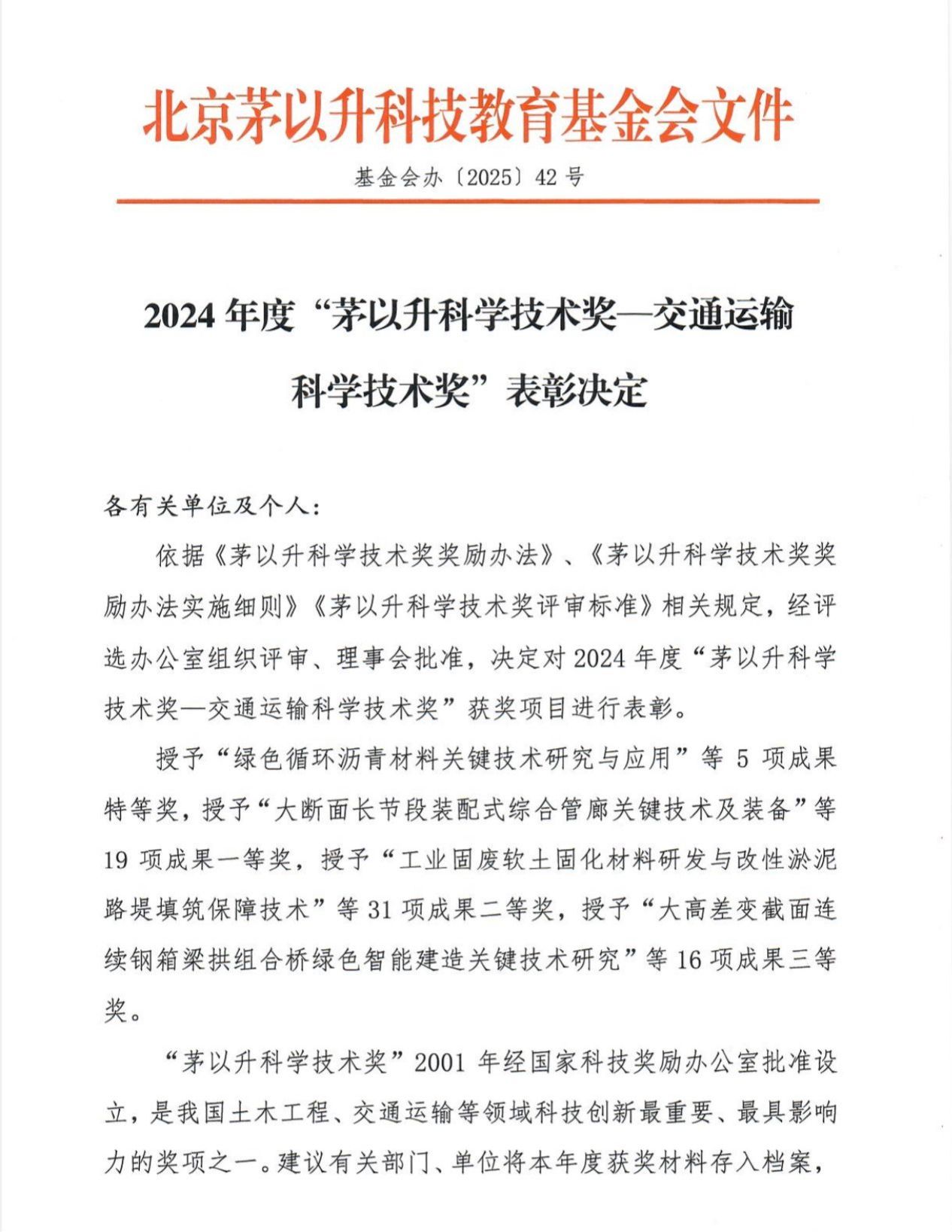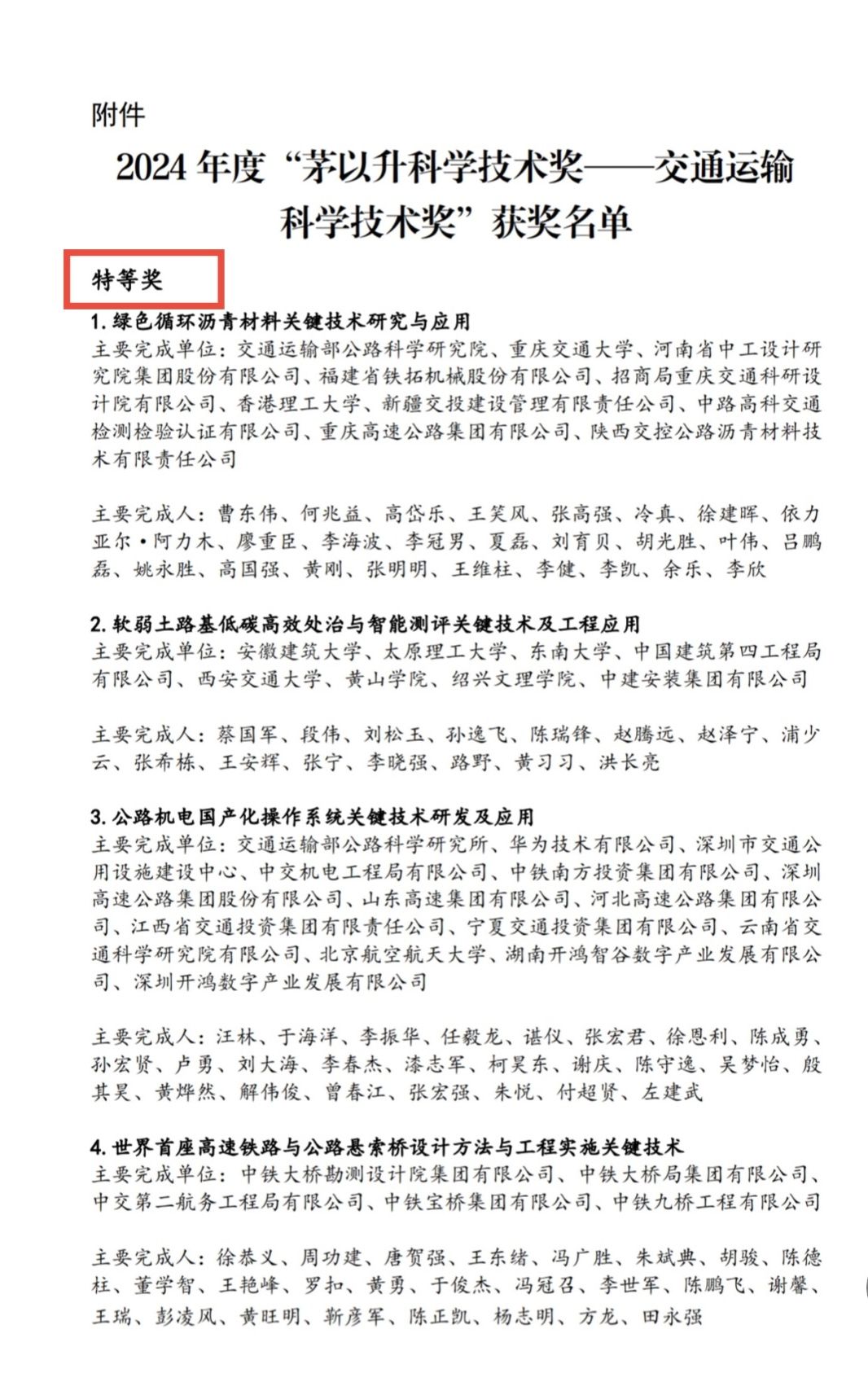 茅以升科学技术奖2001年经科技部科技奖励办公室批准设立,是我国土木工程、交通运输等领域科技创新最重要、最具影响力的全国性科学技术类奖项之一。本次科技奖项面向全国范围征集申报,经材料预审、专家初评、现场答辩等环节,最终评定71项成果获得殊荣,其中最高奖——特等奖仅5项。我校申报的成果从全国众多优秀交通科技研发项目中脱颖而出,彰显了我校在交通运输领域技术研发与科技创新的扎实成果。