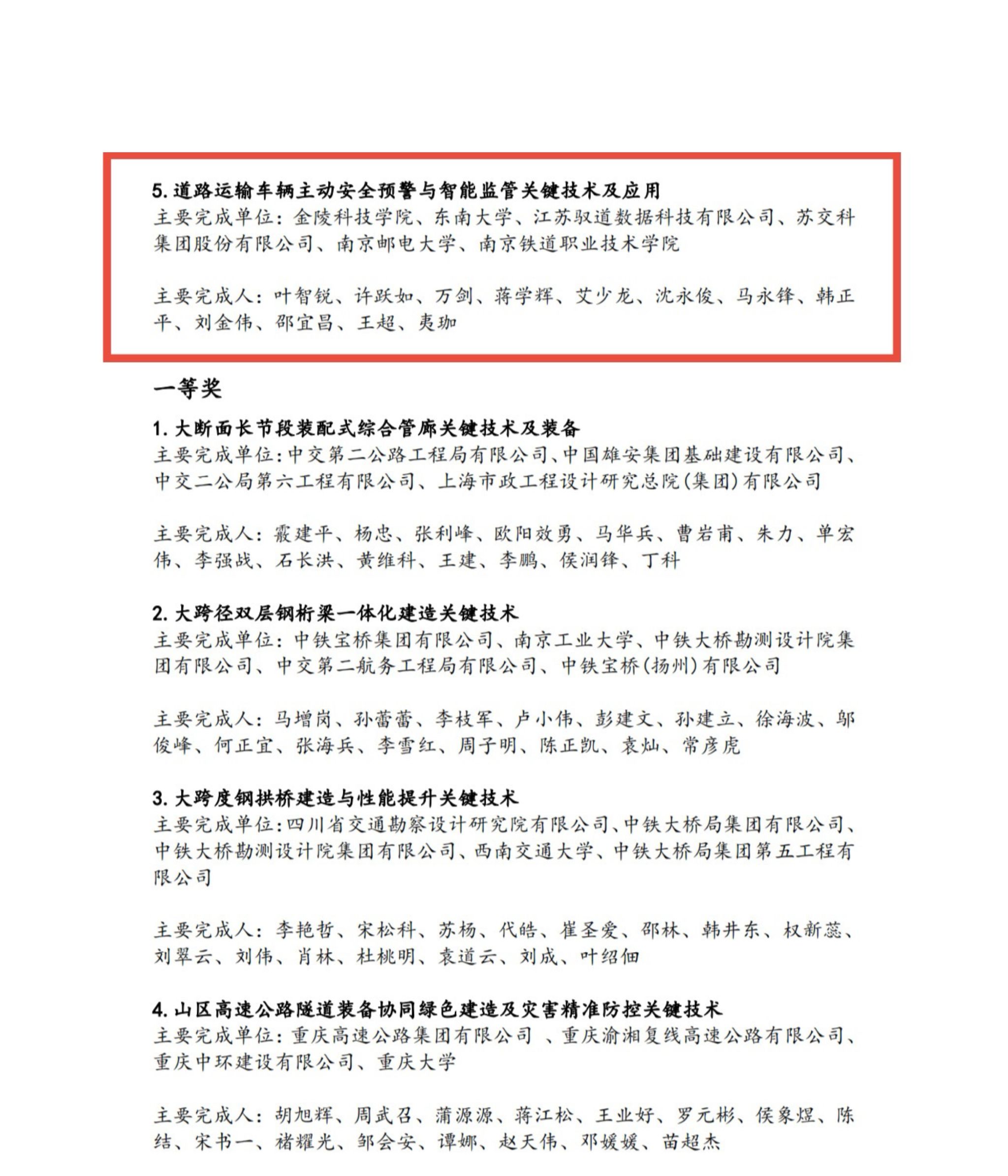 8月26日,北京茅以升科技教育基金会公布2024年度“茅以升科学技术奖—交通运输科技技术奖”表彰决定,由我校“数智低碳交通江苏省高校重点实验室”牵头申报的成果《道路运输车辆主动安全预警与智能监管关键技术及应用》荣获特等奖。