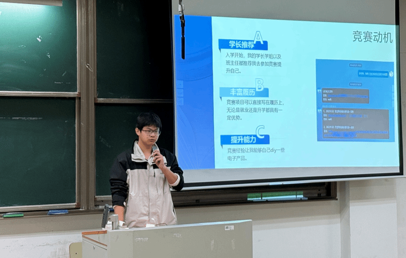 活动中,2023级机器人工程专业唐宇琦、2023级自动化专业丁思盈、2022级物联网专业学生汤轩哲结合自身参赛经历,从团队组建、竞赛效能提升、学业与竞赛的平衡、竞赛资源整合等维度展开分享,通过展示省级、国家级竞赛项目成果,剖析典型案例的操作逻辑,并针对不同专业特点梳理适配性赛事清单,为大一学生提供精准参赛指引,通过介绍学院资深导师团队的指导方向与科研方向,结合全国大学生历届科技赛事案例,系统呈现专业竞赛领域的培养体系与发展脉络,建议同学们在优先保证课业质量的基础上通过竞赛提升实践能力。