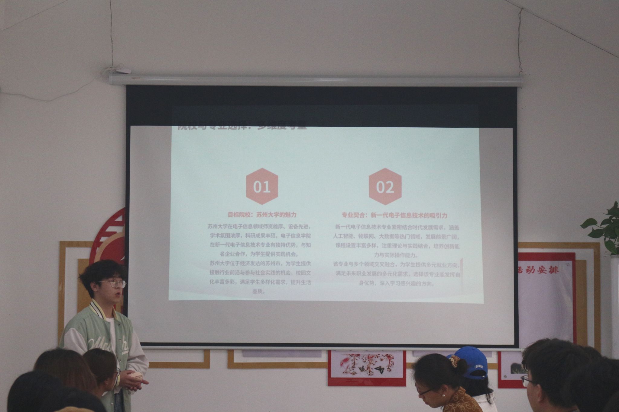 分享会上,四位来自不同年级的优秀学子分享了各自的金科奋斗故事。已被苏州大学拟录取的徐李同学是国家奖学获得者、原院学生会轮值主席。他讲述了自己考研上岸的心路历程,分享了备考过程中的学习方法、时间管理技巧以及面对压力时如何调整心态,激励在场有考研意向的学生坚定信念、勇往直前。明发体育(电子)股份有限公司校长奖学金获得者、月桐路科技创新团队负责人李蕊同学聚焦科研领域,详细介绍了自己在科研道路上的点滴付出与丰硕成果。她的经历使在场学生深刻感受到科研探索的艰辛与乐趣,也激发了大家的科研兴趣。党员代表赵雨欣同学分享了自己的入党初心和入党历程。借助自己丰富的社会实践经验,她勉励在场学生要不断提升思想觉悟,以实际行动彰显新一代青年的使命担当。大二学生干部代表王凤仪同学围绕自己担任学生会组织部部长的工作经历,畅谈在组织活动、沟通协调、团队管理等方面的收获与成长,为有志于学生工作的学生提供了有益参考。