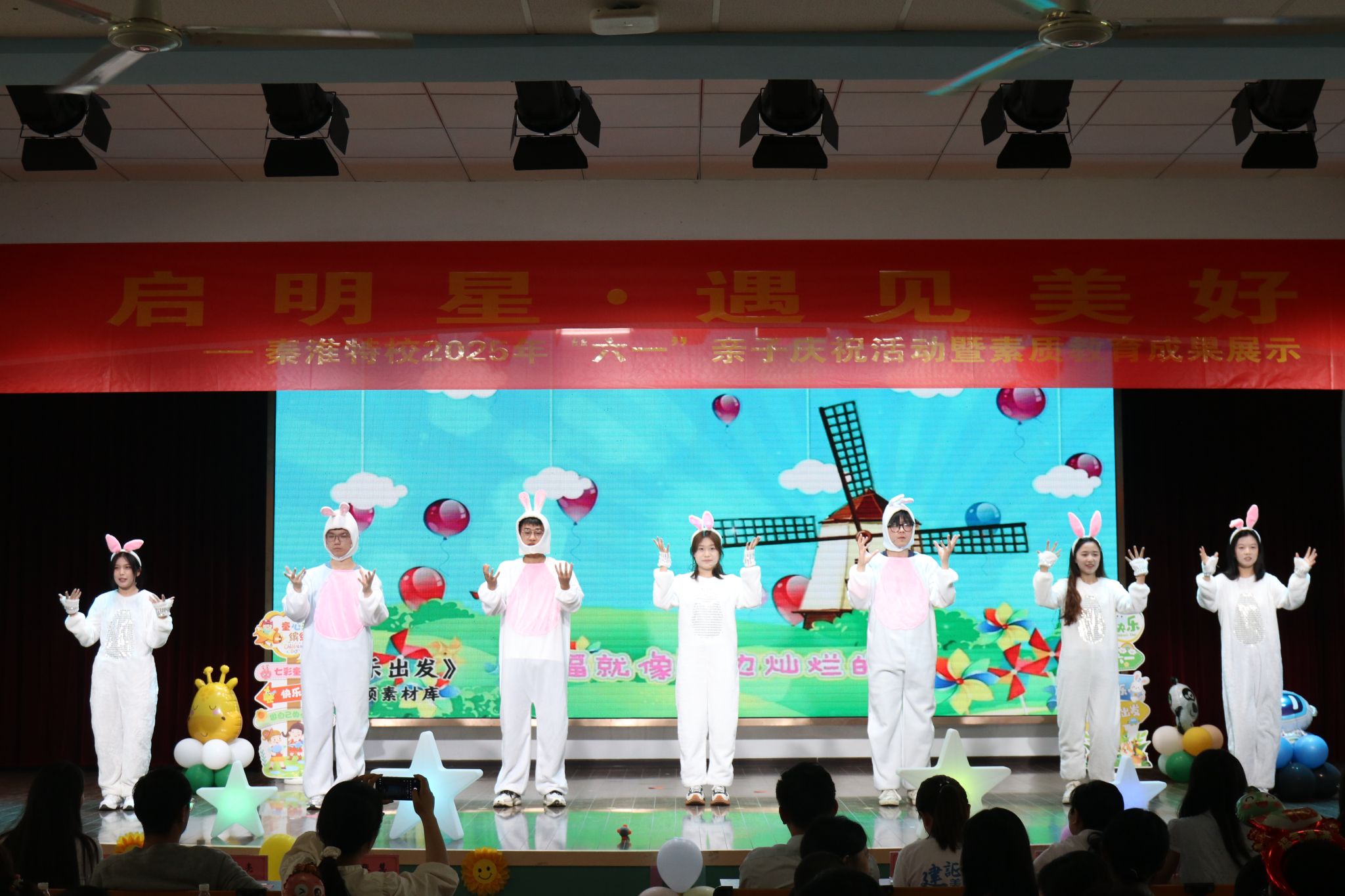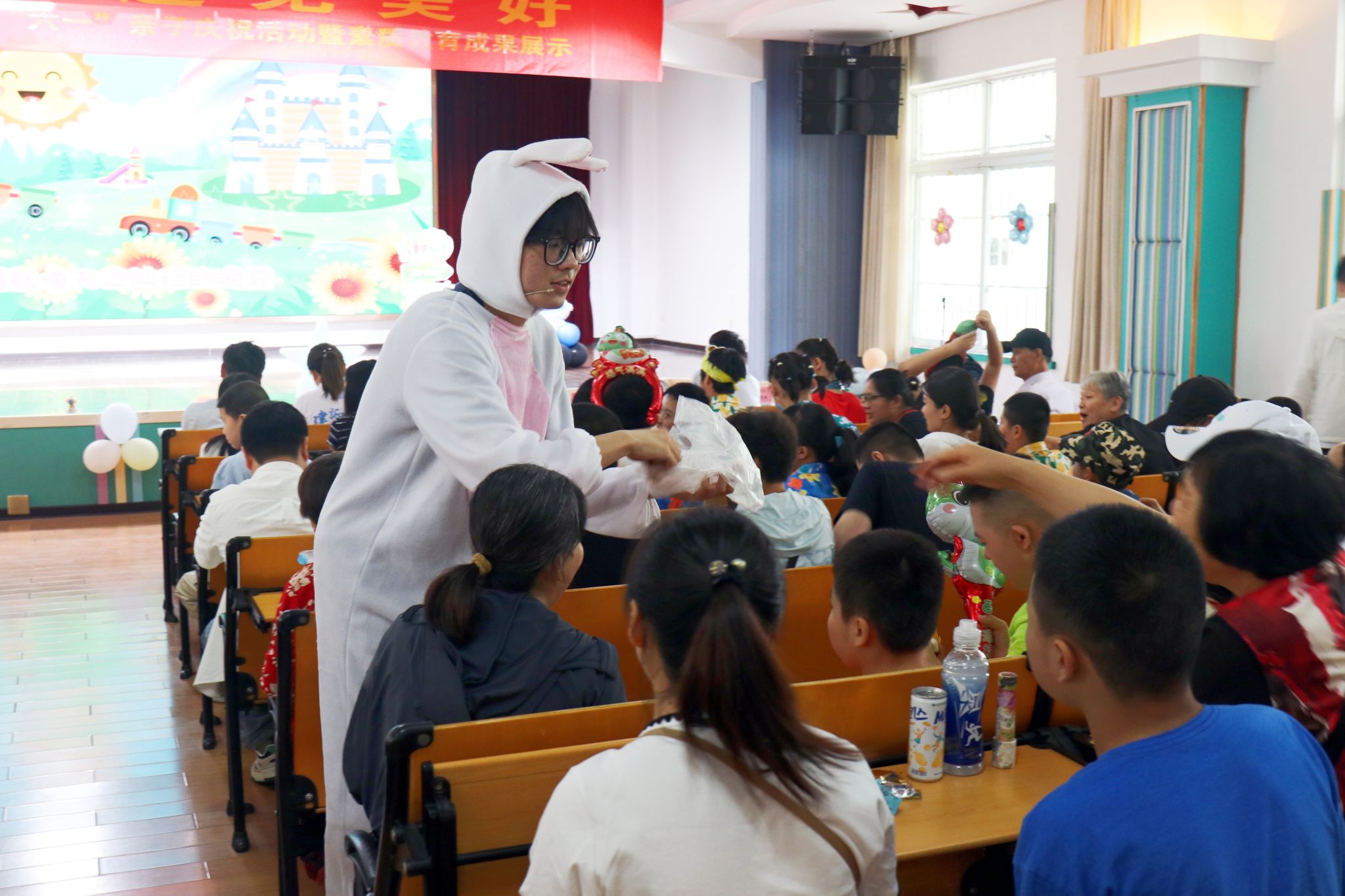伴随孩子们的欢声笑语,精彩纷呈的表演如期启幕。心理社的志愿者们用一场充满哲思与温情的情景朗诵《I want 兔》,带领大家走进孩子们内心的奇妙宇宙。该剧通过七只小兔子的成长困惑与心灵呐喊,生动探讨了“接纳独特自我”与“多元成长价值”的主题,传递出了特殊教育中“尊重差异、拥抱独特”的温暖信念。接着,志愿者们还发放了精心准备的小礼品,在孩子们惊喜的欢呼声中将现场气氛推至了高潮。