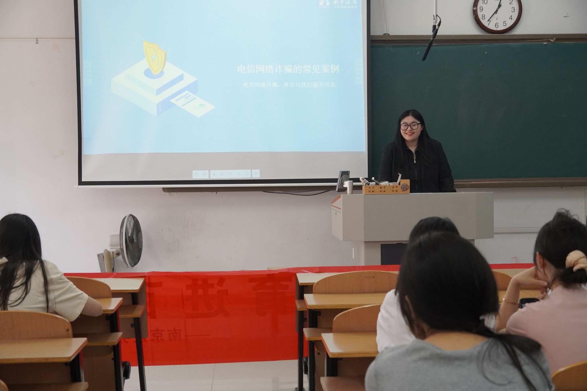 6月4日中午在幕府校区图教楼B102,人文学院举办了防范电信网络诈骗专题讲座,本次讲座邀请南京证券财富顾问侯思齐主讲,辅导员张琳老师主持,近100名学生代表参加了讲座。