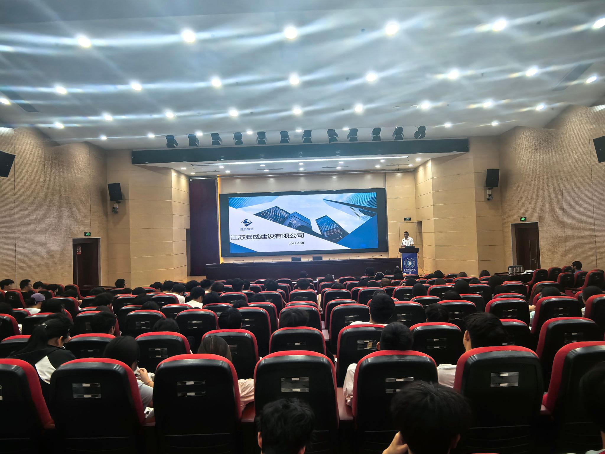 为进一步深化产教融合,精准对接行业需求,提升学生学业规划、职业规划意识与能力,6月18日下午,建筑工程学院在科技楼报告厅举行与江苏腾威建设有限公司校企合作宣讲会。江苏腾威建设有限公司总经理茆金林、建工学院党委副书记郑庆秋出席会议,24级学生代表参加会议。宣讲会由院学工办主任鲍飞豹主持。
