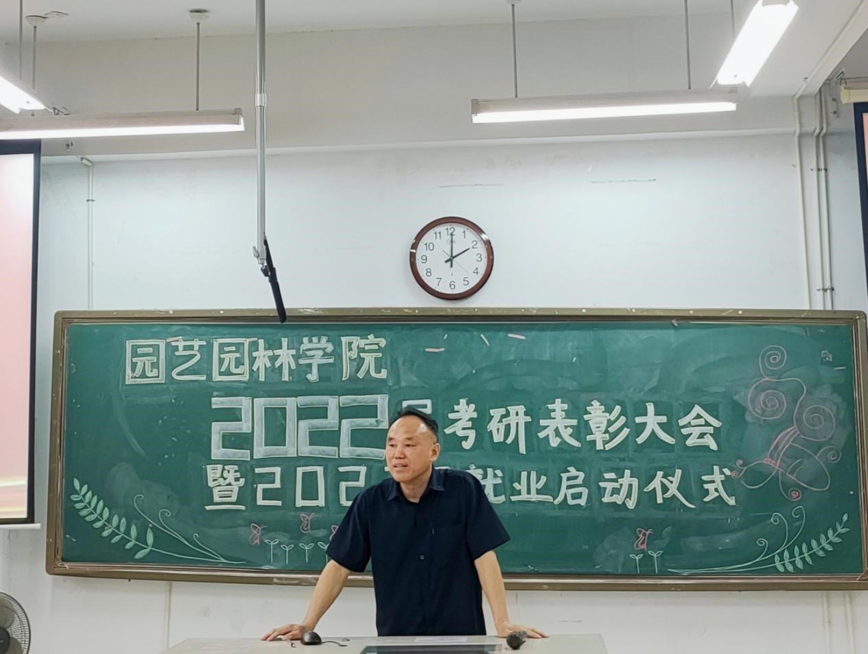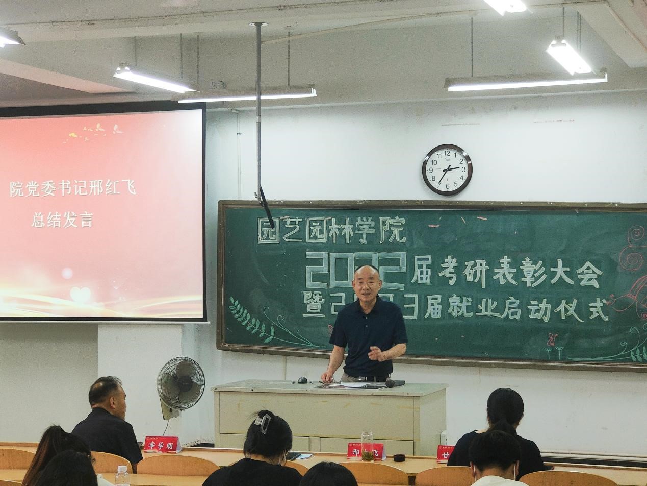 为深入推进园艺园林学院学风建设,营造学院良好的考研氛围,进一步激发调动学生考研的积极性,同时帮助学生进一步了解考研形势,做好考研准备,2022年6月8日13点30分,园艺园林学院2022届考研表彰大会暨2023届就业启动仪式在图教楼B205隆重举行。学院党委书记邢红飞、院长宰学明出席本次大会,院学工办全体辅导员、18级考研录取在校毕业生以及其它年级在校生参加。大会由学院党委副书记甘黎明主持。