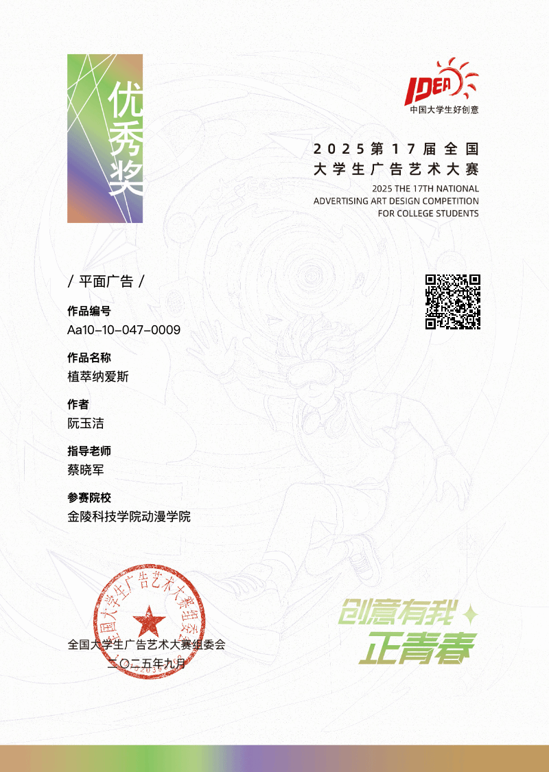 在国赛环节,22级视觉传达设计系学生肖静、姚伊涵的《不可驯服,你的锋芒自带“宽带”》荣获全国二等奖;阮玉洁的《植萃纳爱斯》、顾鑫的《品牌视觉形象识别手册》获全国优秀奖。省赛中,我院学子作品涵盖平面广告、策划案及视觉创意等多个类别。