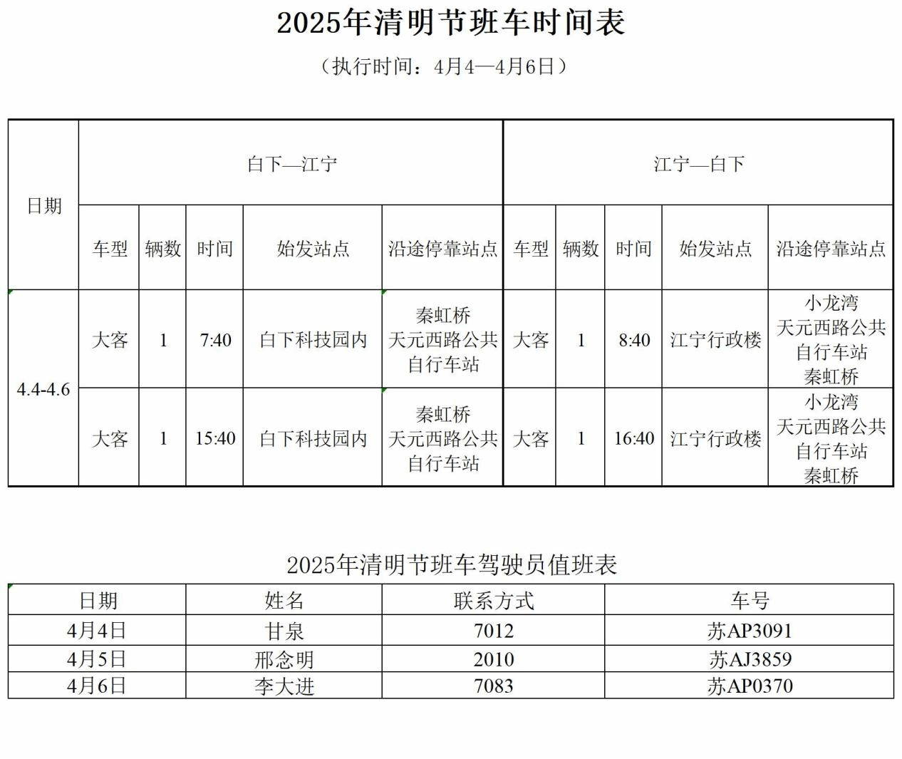 根据学校工作安排,现将2025年清明节班车时间安排公布如下: